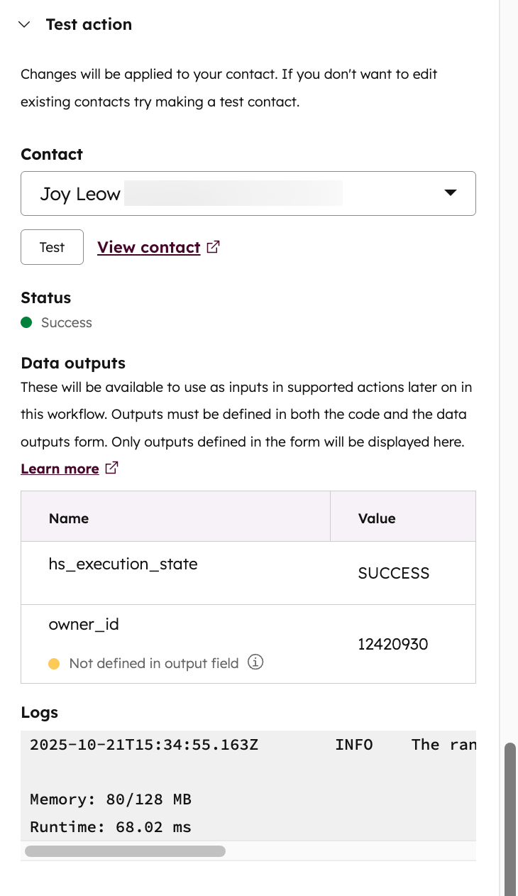 After setting up your custom code action, and turning on the workflow, to see the output of the logs from your custom code action, learn how to review your workflow’s action logs.