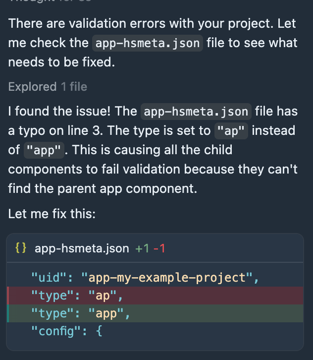 When developing projects locally, you can use the HubSpot Developer MCP server to troubleshoot local development issues. For example, you can prompt your client’s AI assistant to validate your local project files.
